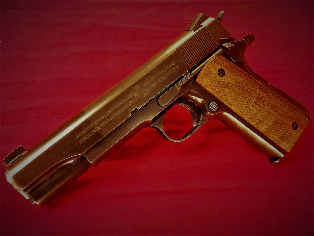 • colt 1911 45 acp gun sidearm war pew steel and wood