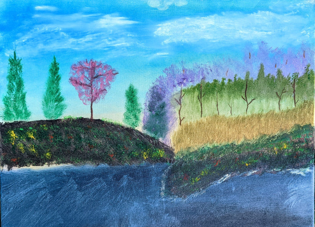 • Our latest creation. Liquid white and oil paint on canvas. Who needs a getaway when you have these views from your front porch.