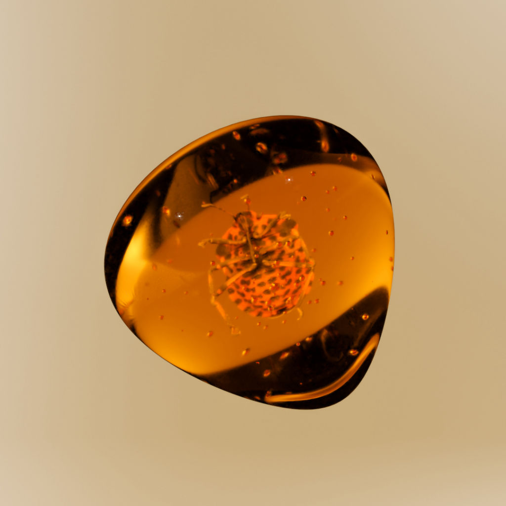 Orange amber with a trapped Graphosoma Italicum.