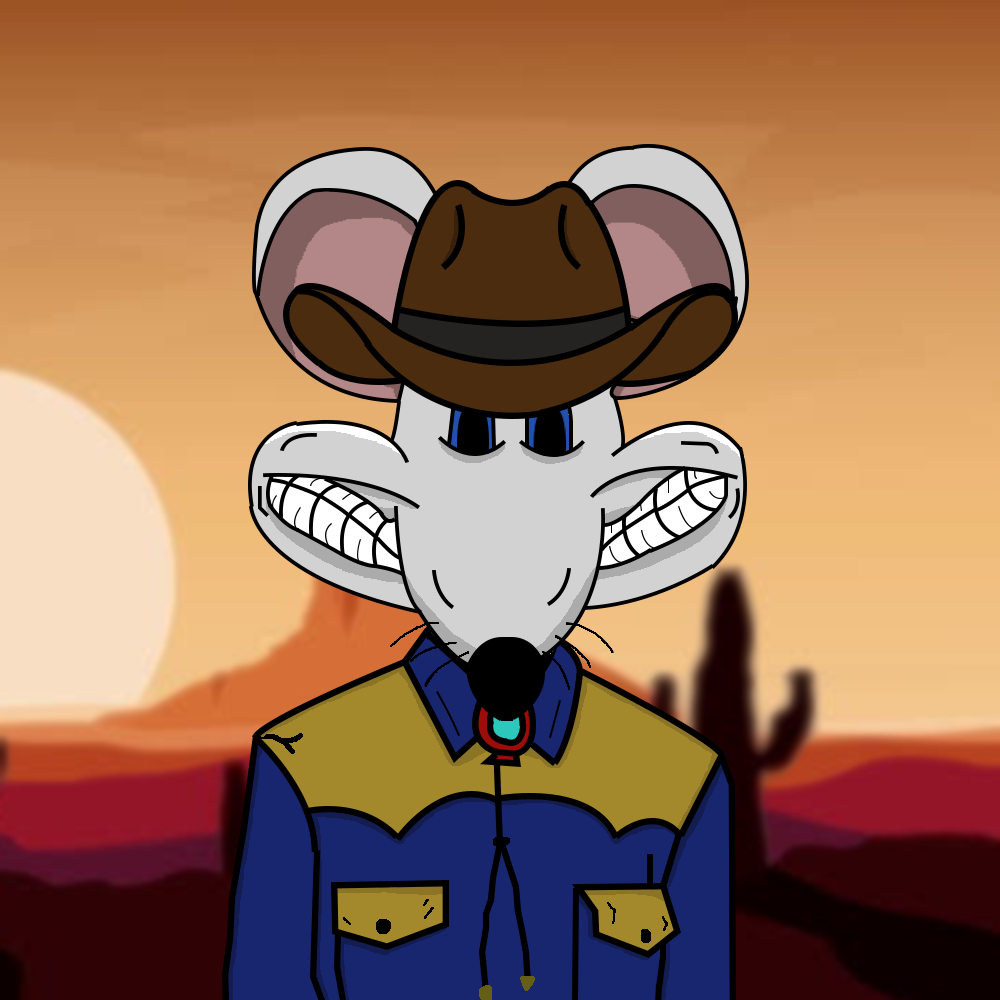Mad Rat, who is a member of the Mad Ratz. Wearing a cowboy hat and long sleeve shirt. He's a light grey rat with blue eyes. This rat bring good fortune and good times.