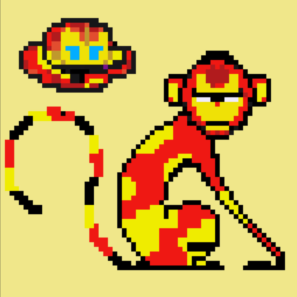 My new collection of NFTs. Funk Monkey is cryptoFunk collection inspired by Evolution Darwin and CryptoPunk. All are hand made Created on 64 x 64 pixel. Each model will only have one unit, so it will be very unique. Limited Collection only 100/100 minted at Davinci Gallery on Harmony Blockchain. Please enjoy and make it a valuable asset. Detail : Male Like Iron Man Body Yellow and Red Iron Monkey Brown Yellow and Red Iron Monkey Suit Yellow and Red Iron Monkey Helmet Yellow and Red Iron Buster Head Yellow and Red Iron Monkey Long Tail