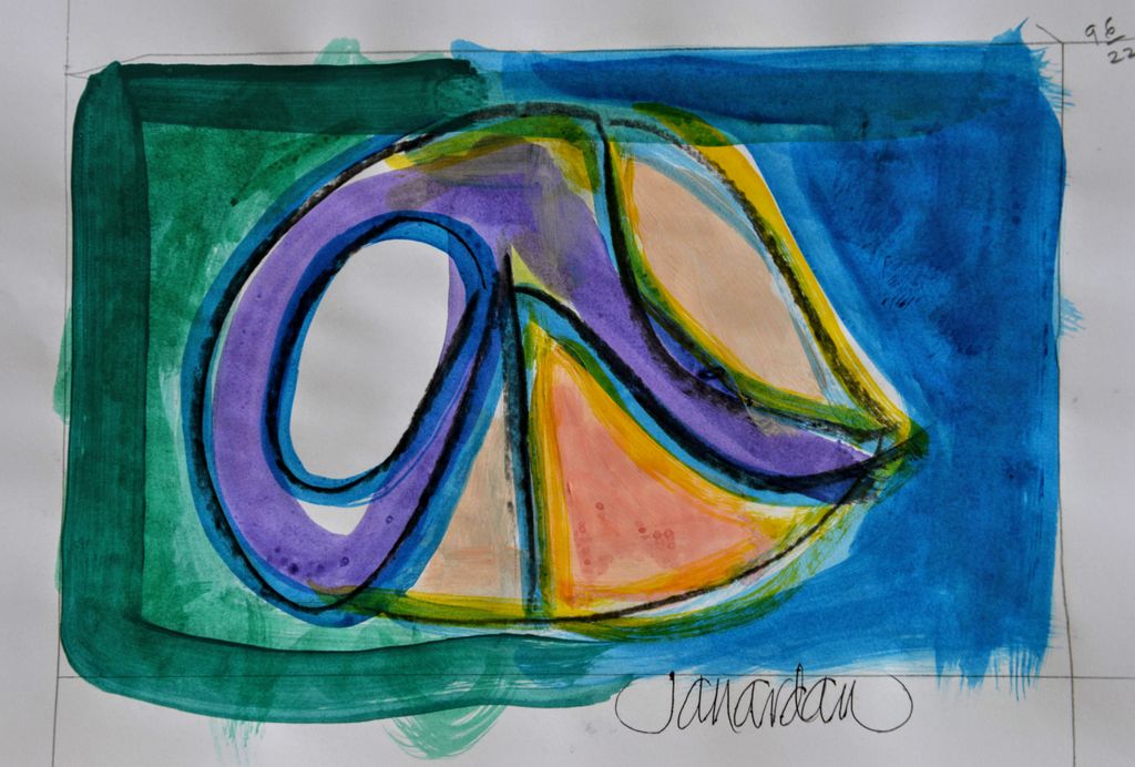 • Acrylic and charcoal on paper. A collection of abstract artwork by 80 year old artist Janardan. His deep and intriguing work expresses a life-long passion for art and displays a delicate balance between form, structure, movement, light and colour.