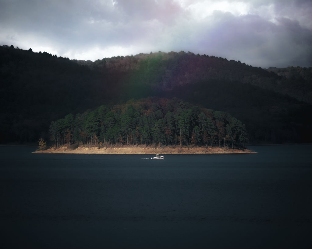 • A boat cruises by Rainbow Island