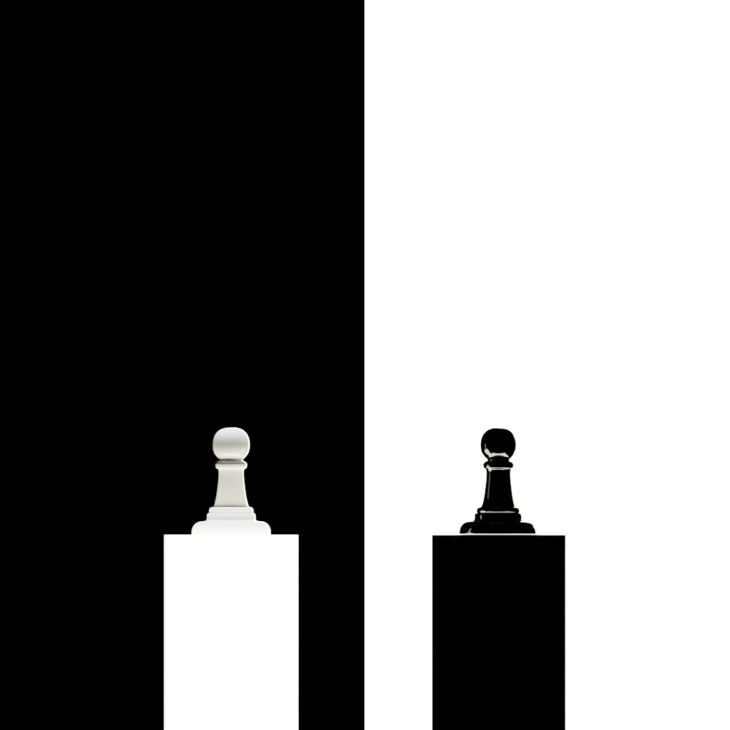 'Black & White' (2021) shows two pawn figures standing on pillars. The one white, on a white pillar with a black background. The other black, on a black pillar, with a white background. Creating a very strong contrast and a quiet, abstract image.